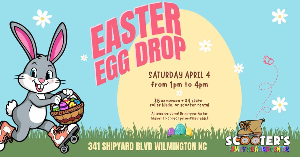 ![]() Pine Valley Baptist Easter Egg HuntSAT APR 4: 10AM @ Pine Valley Baptist Church - PV • Magic Show by No Sleeves Magic • Photos with the Easter Bunny • Photo Opportunities • Face Painting Egg hunts will begin promptly at 10:00 AM and are open to children preschool through 5th grade! Bring your baskets and join us for a morning full of fun, laughter, and Easter excitement. We can’t wait to see you there! | ![]() Easter Egg DropSAT APR 4: 1-4Pm @ Scooters - ILM $8 admission and $4 skate, roller blade, or scooter rental. You are welcome to bring your own skates and scooters, but no other riding toys will be permitted. |