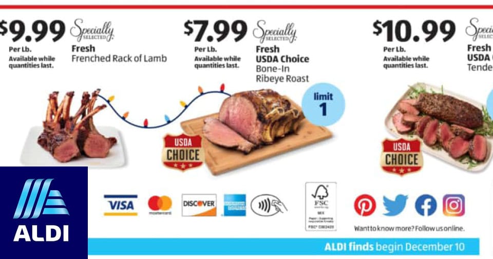 Get ready to stock up for the holidays! Starting Wednesday, Dec. 10, Aldi’s will have rack of lamb for $9.99/lb., ribeye roast for $7.99/lb., and beef tenderloin for $10.99/lb. These specials run through Tuesday, Dec. 16, so plan ahead and snag the best cuts for your festive meals.